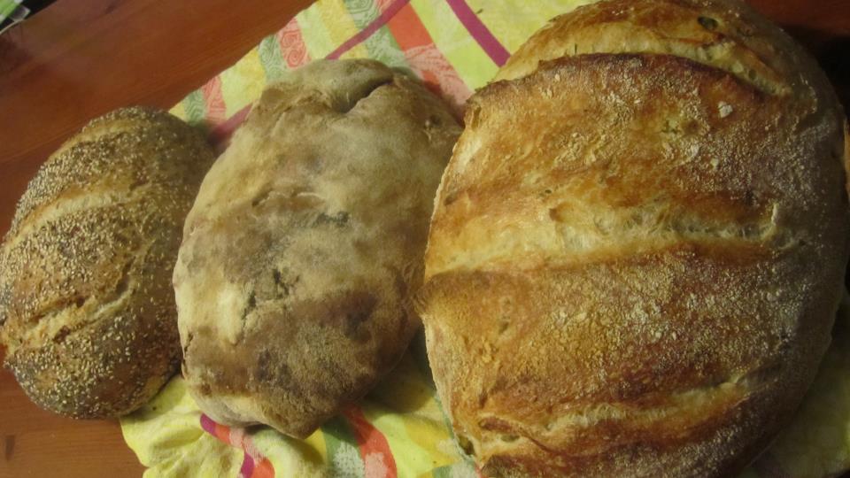 | From L to R: seeded rye, 5 grain fig and walnut (wood fired oven), rosemary olive |