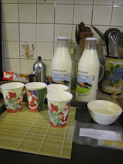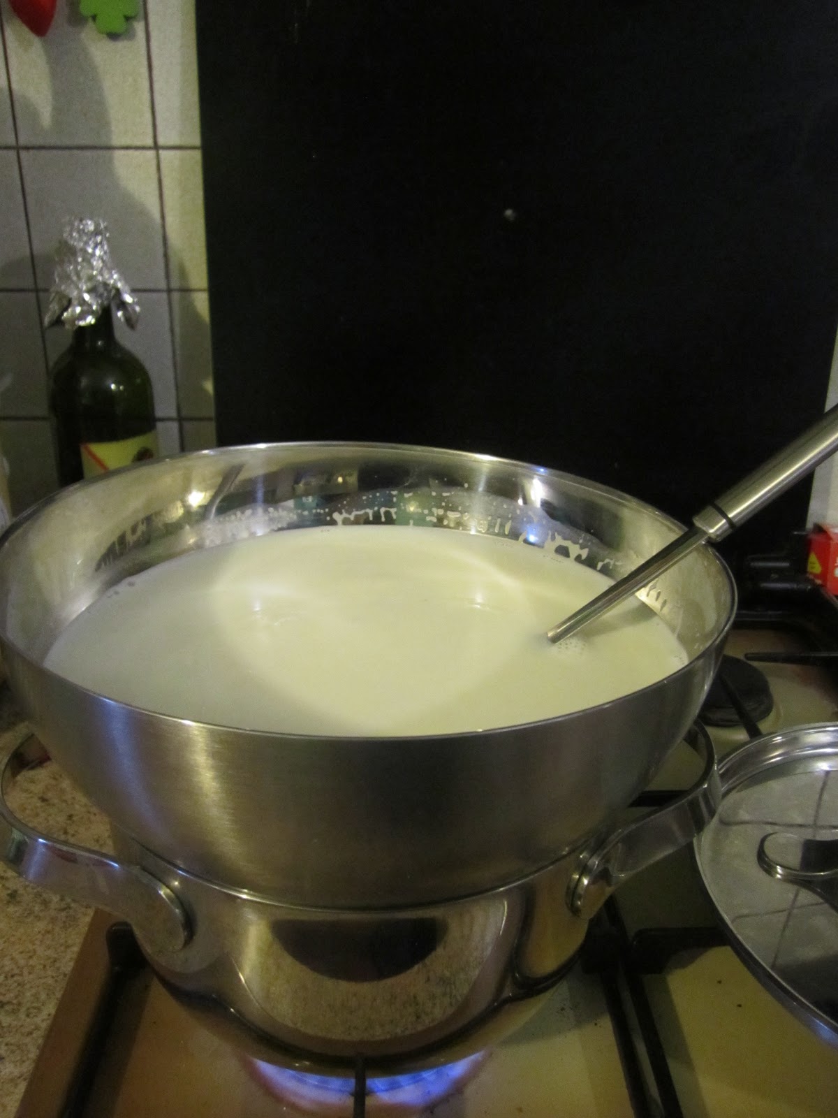 I was supposed to gradually heat the milk in a simmering double boiler removed from heat, but as I pasteurized the raw milk first and was too impatient to cool it and then reheat it, I just let it cool down to the right temperature.
