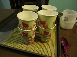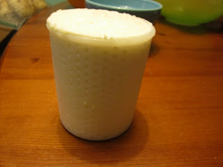 For this cheese, the ingredients were milk, a mesophilic (low temp) culture or buttermilk (which doesn’t exist here), rennet, and salt. The molds were made out of paper cups with holes punched in them, and it was pressed with other paper cups filled with water.