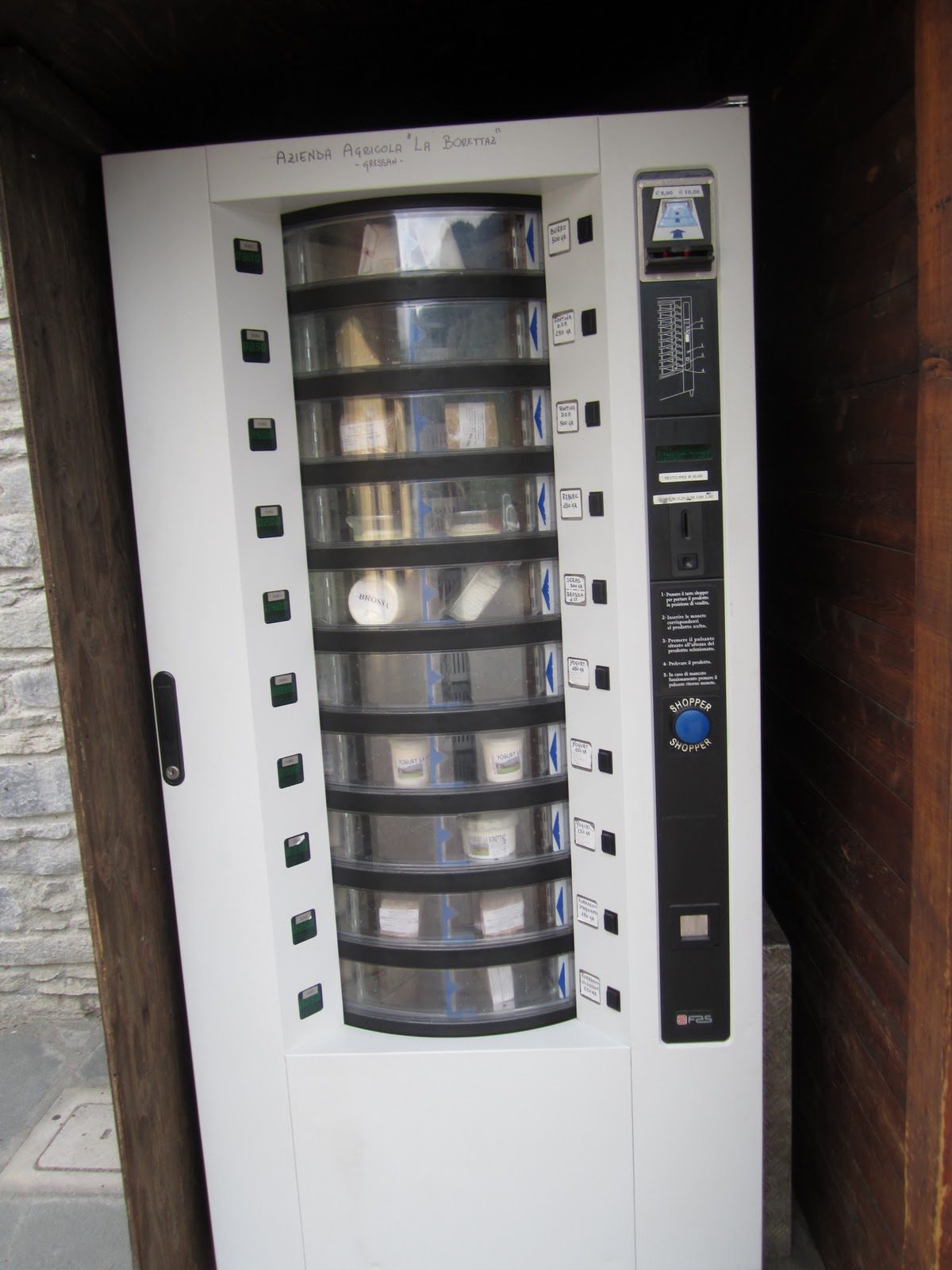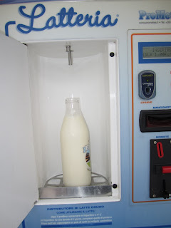 First, you gotta know where I get my milk, as it is pretty awesome. It’s possible I’ve mentioned it before, but it is so cool it deserves a reminder. There is that dairy down across the cow field, and there is a freaking VENDING MACHINE for raw milk, and another for dairy products like butter, yogurt, and various cheeses they make. It is right outside the barn. It’s straight from the cow, not homogenized, not pasteurized, just kept cold til I stick in my euro coin, put by milk bottle under the spout, and press the button. And voila! A liter of tasty, fresh milk comes out. It’s pretty strong tasting now, as the cows just came down from their summer holiday eating the tender grass at the top of the Alps that makes them produce milk with a particular flavor which gives Fontina (the real stuff, not the fake Fontina sold outside of this region) it’s particular flavor.