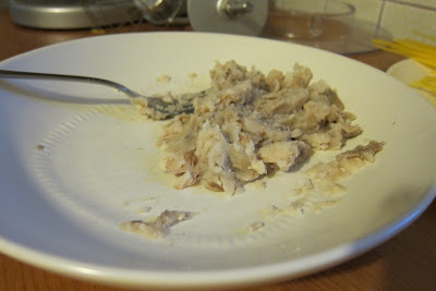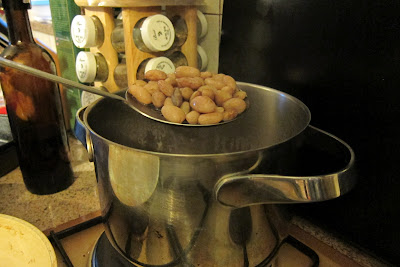 When the beans are done, take a slotted spoon and scoop a slotted-spoon’s worth of beans out of the pot, letting the liquid drain out. Put the beans in a bowl, and squish with a spoon.
