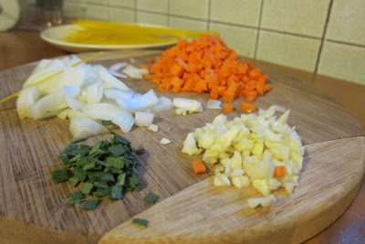 Chop up your onion, mince the garlic and sage, cut the carrot into small cubes, and cut the tomato into cubes.