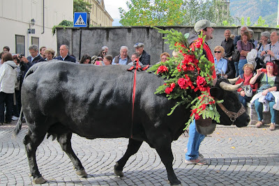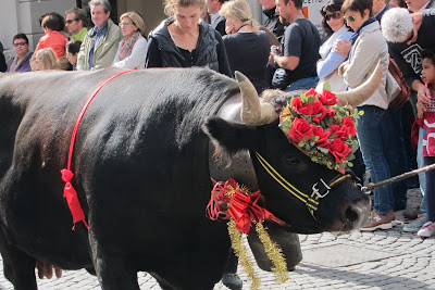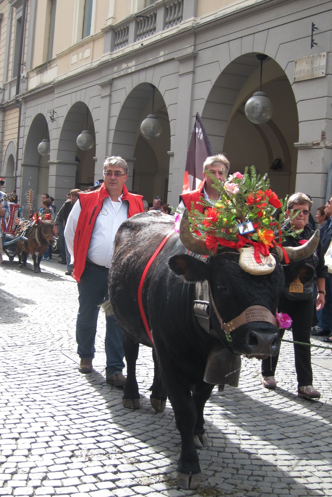 I was shocked by the sheer number of people crammed into the historic Roman center of Aosta. There were marching bands, a giant stage, a cheese market, and many thousands of people lining the cobblestone streets, craning their necks to look at the cows walking by. Many of the farmers dressed up in historical garb, and lead their bedazzled, flowered, and ribboned cows through the ancient streets. It’s a cow beauty pageant! Most of the cows have ribbons around their bellies, on their tails, and wrapped around their horns, and a massive, towering flower arrangement on their heads. It’s simply fabulous….