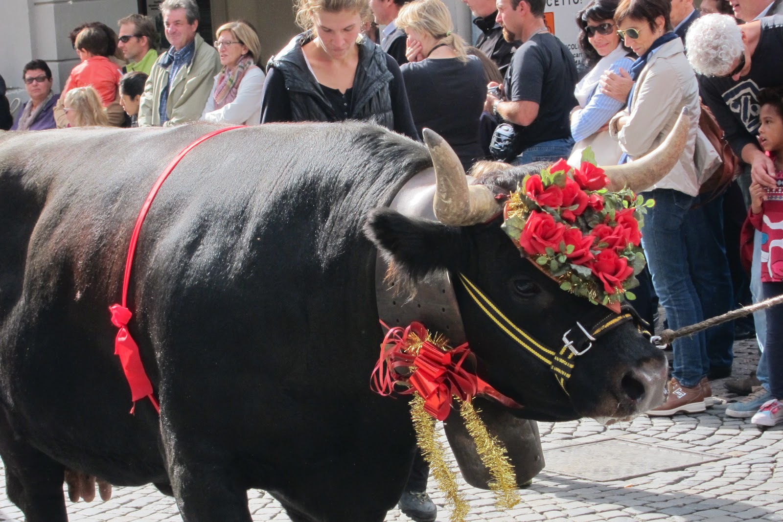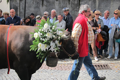 Once upon a time, the farmers walked all of their cows up, up, UP near the tip tops of the mountains at the beginning of the summer, and then walked all their cows back down at the end of the summer. Thanks to modern technology, most farmers transport their cows in trucks nowadays, but they still celebrate the return of the cows.