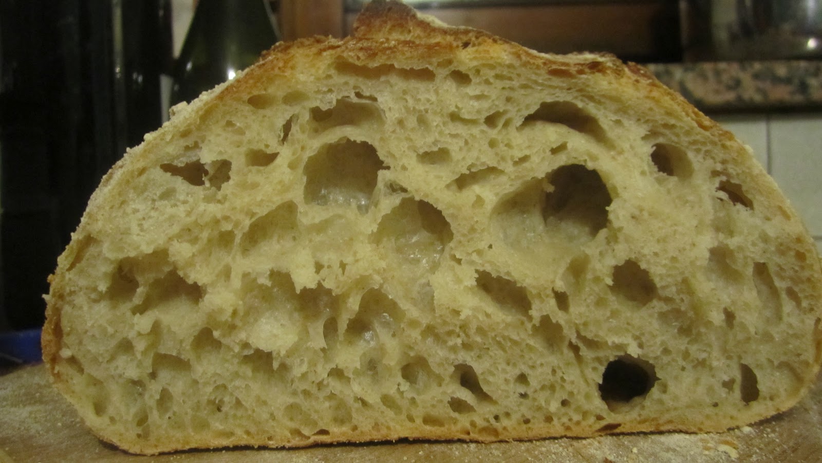| This is what open crumb looks like! This one is fresh out of the oven. 60% white, 20% semolina, 20% whole wheat. |