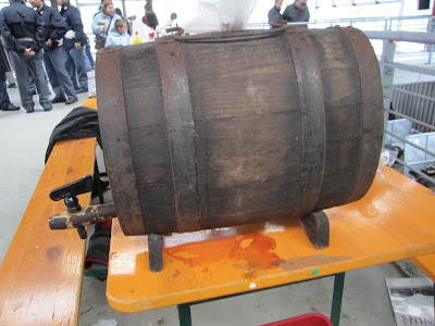 The whole event is really peculiar. At the gates there are young women dressed in traditional Alpine clothing. They sell decorated cow bells, local cheese, cheap beer, and cotton candy. The thousand or so people have all brought copious amounts of food and drink, spread out in the hundreds of picnic tables overlooking the arena. It is all pretty much traditional food. Big rounds of darkened cheese, hunks of dark and dry bread, barrels and unmarked bottles of homemade wine, piles of aged sausages, and even a big old half eaten hairy leg of what I presume to be a goat or pig… feet, fur, and all. People are wrapped in blankets, holding a knife in one hand, a giant hunk of cheese in the other, with a bottle of wine beside them. The leap up and cheer when their favorite cow wins, and look downtrodden with their cow runs or wanders away. There are at least 5 different TV news stations covering the event. Below the picnic area, there is the barn, where hundreds of beautiful brown cows are being lovingly coddled by their owners, or teenagers are sitting on their feed bins sneaking drinks of wine, and texting friends. Some of the cows even have corporate sponsors, with the name of the companies name engraved onto the cows’ decorative face plates. Another strange aspect: the cows absolutely must be pregnant. The explanation I have heard is that pregnant cows are much less likely to get into a violent fight.